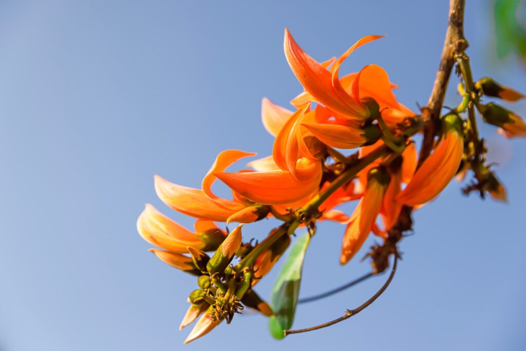 The Indian tulip tree (Butea monosperma) is a 15-metre tree that in spring is covered with orange and red flowers so bright that they look like flames. In India, it is celebrated in poems and songs, as its flowers herald the arrival of the most joyful season. Dyes, resins and traditional medicines are also obtained from this tree.