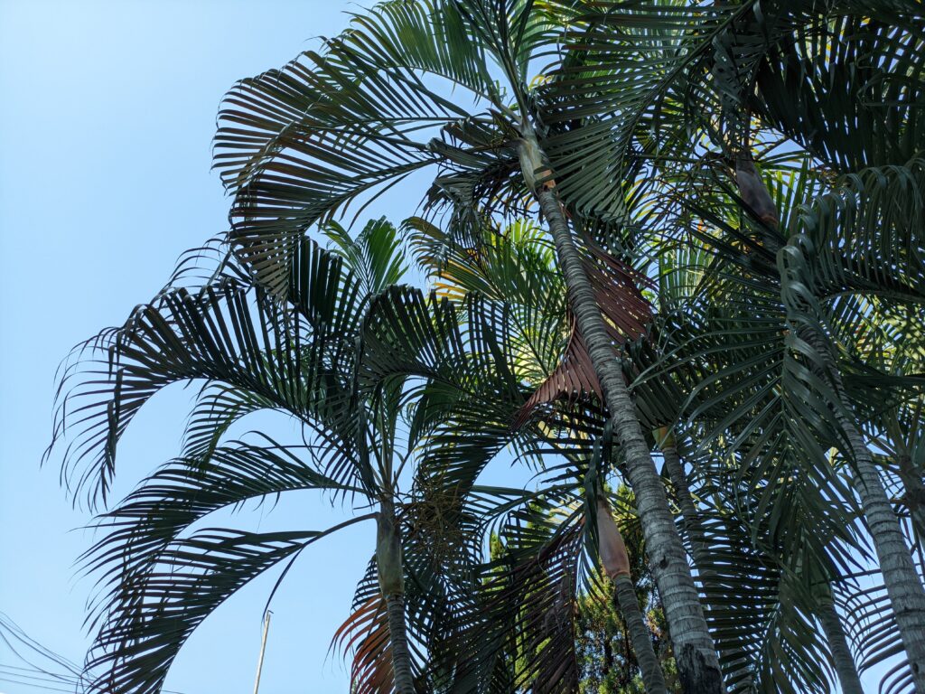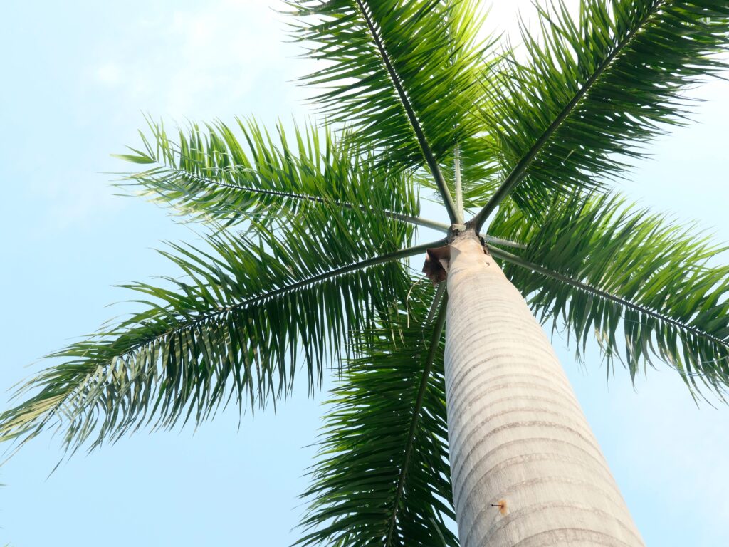The Royal palm (Roystonea regia) can grow up to 30 metres tall and is notable for its smooth, light grey trunk, as straight as a column. It is the national tree of Cuba, where it dominates the rural landscape. Its long, arched leaves form a majestic crown that gives it its “royal” appearance. It is also cultivated in many tropical regions for its beauty and resilience.