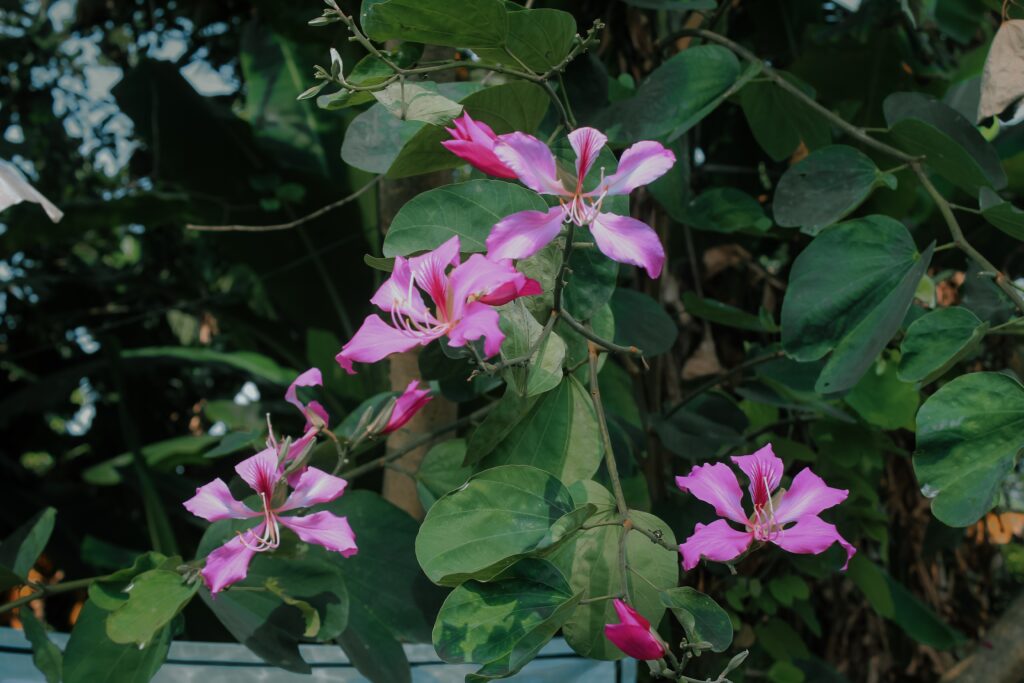 The Orchid tree (Bauhinia spp.) is famous for its spectacular pink, purple or white flowers, reminiscent of orchids. It blooms from late winter to early summer, filling parks and avenues with colour. It can grow up to 12 metres tall and its split-heart-shaped leaves make it even more special. In Hong Kong, it is a national symbol.