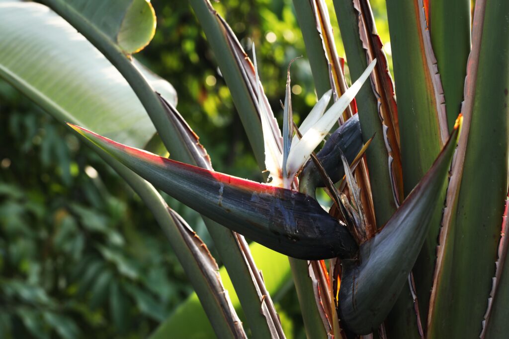 Strelitzia alba, known as the White Bird of Paradise, is an imposing plant that can reach up to 10 metres in height. Its large, elongated leaves form an elegant crown, and its white flowers, very different from the colourful Strelitzia reginae, appear almost all year round. It comes from South Africa, where it grows in humid forests and riverbanks. In the Canary Islands, it is highly prized as an ornamental plant.