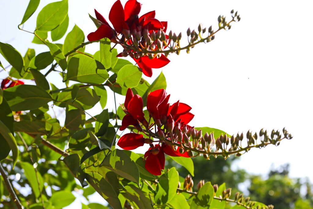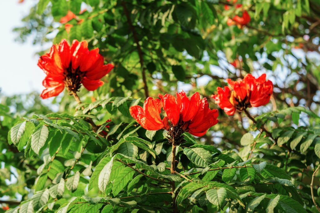 The African tulip tree (Spathodea campanulata) surprises with its large red or orange flowers that look like flames. Native to tropical Africa, it grows up to 20 metres tall and provides generous shade. Its cup-shaped flowers collect rainwater, attracting birds and butterflies. It is highly ornamental, although in some regions it behaves as an invasive species.