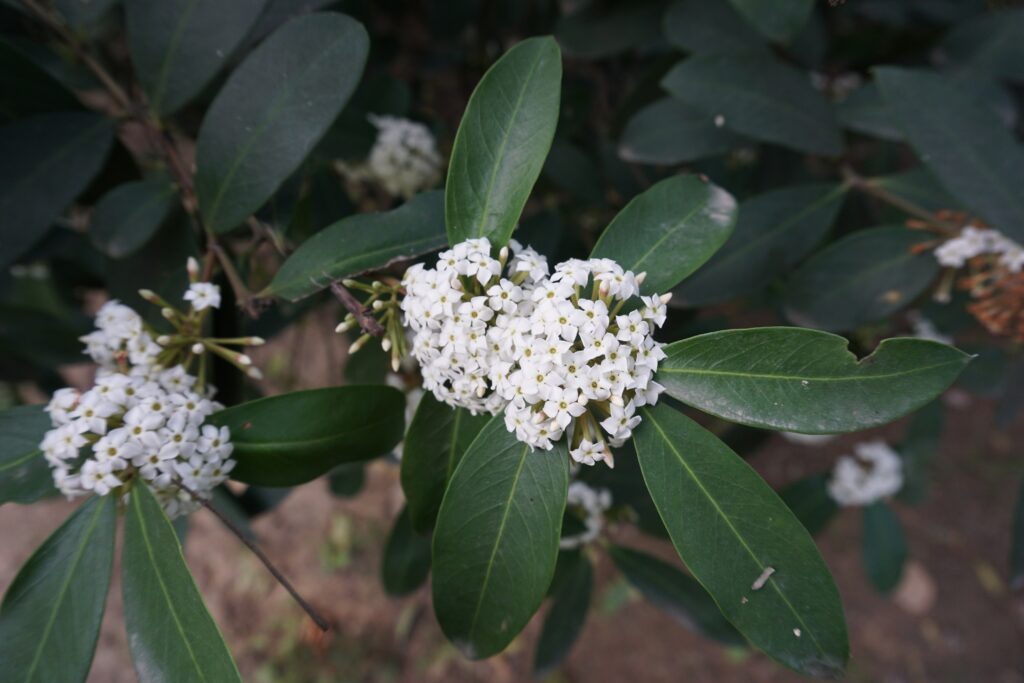 The Wintersweet (Acokanthera oblongifolia) is a perennial shrub from southern Africa with glossy green leaves and white or pink flowers at the end of winter. Although decorative, its fruit is poisonous and should not be eaten. It is cultivated in gardens for its elegant form and resistance to heat.
