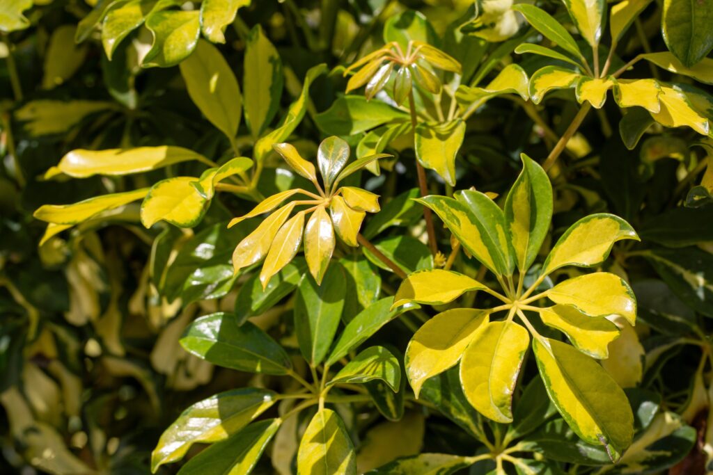 The Umbrella tree (Schefflera actinophylla) comes from Australia and Papua New Guinea. Its large leaves spread like an umbrella, and in summer it produces long spikes of nectar-rich red flowers that attract birds. It can grow up to 15 metres tall and is valued in large gardens for its exotic appearance. In some tropical areas, however, it behaves like an invasive species.