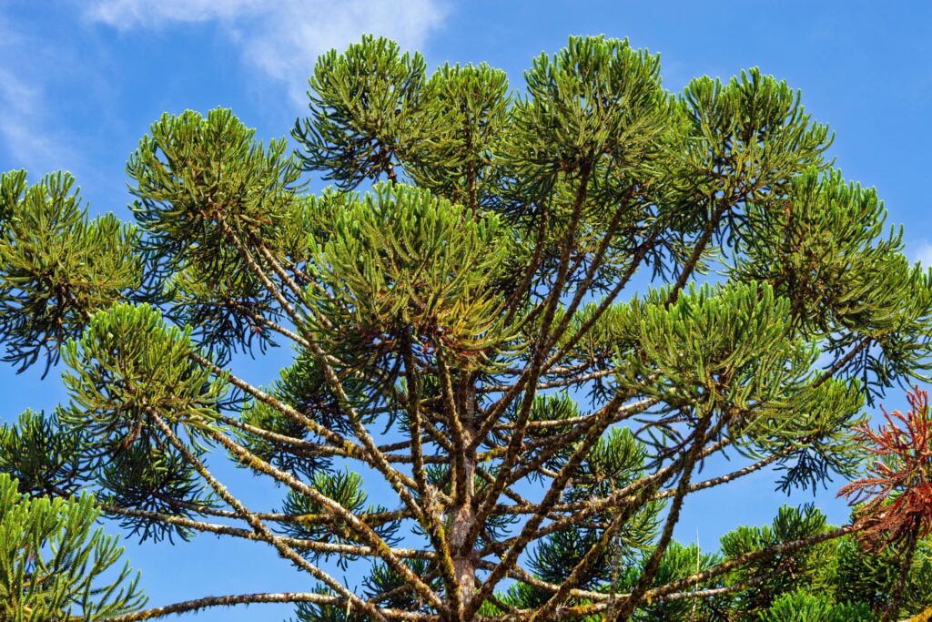 The Norfolk Island pine (Araucaria heterophylla) is not a true pine, although it resembles one. It is distinguished by its symmetrical shape, with branches arranged in almost perfect tiers. In its native habitat it can grow up to 68 metres, though it remains smaller in gardens. Discovered in 1774 by Captain Cook on Norfolk Island (Australia), today it is widely grown as an ornamental tree and even as a so-called ‘tropical Christmas tree’.