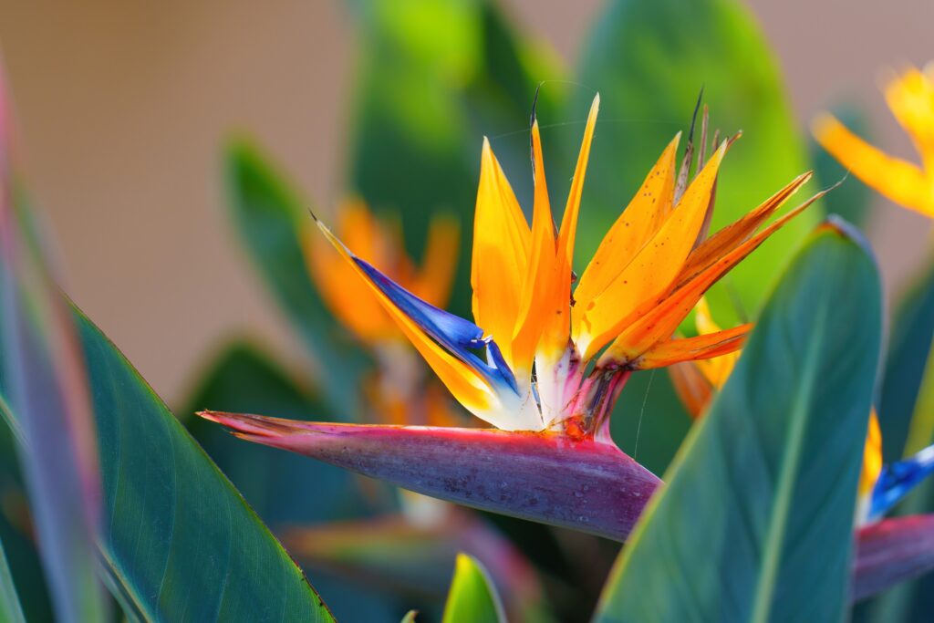 Strelitzia reginae is one of the most iconic plants of the Canary Islands. Its orange and blue flowers resemble the head of a tropical bird. Elegant in appearance, it can grow up to 1.5 metres tall and thrives in sunny, mild climates. It is very popular in gardens and also as a cut flower.