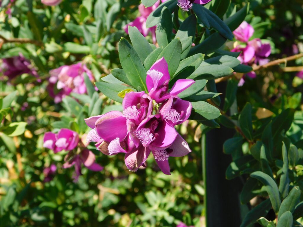 Polygala myrtifolia is an evergreen shrub from South Africa that grows 2–4 metres tall. Its green leaves and violet, butterfly-shaped flowers make it very ornamental. In mild climates it can flower almost all year round. In its homeland it is also believed to have medicinal properties.