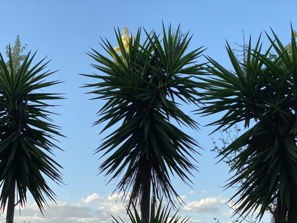 The Elephant’s foot yucca (Yucca elephantipes) is one of the most prized yuccas because it has no thorns, making it safe and perfect as an ornamental plant. Its thickened base resembles an elephant’s foot, hence its name. It can grow up to 10 metres tall and in summer surprises with large clusters of white bell-shaped flowers. In Central America, its petals and tender shoots are even eaten.