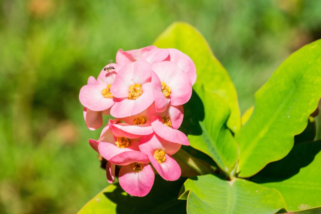 The Crown of thorns (Euphorbia milii) is a shrub native to Madagascar, highly prized for its red flowers that contrast with its thorny stems. It can reach 1.5 metres in height and flowers almost all year round if it gets enough sun. Its name refers to the crown of thorns in Christian tradition. Like other euphorbias, it contains an irritating white latex, so contact with the skin and eyes should be avoided.