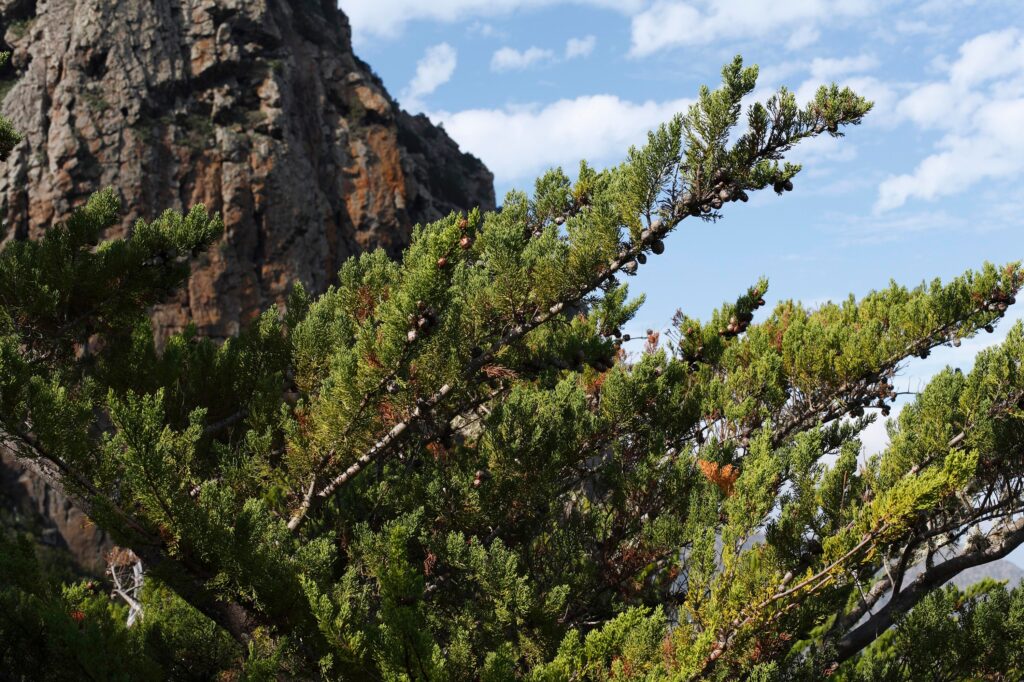 The Canary Islands juniper (Juniperus cedrus) is a robust tree that can grow up to 20 metres tall. Its needle-like leaves and reddish fruits make it unmistakable. Once very abundant, today it takes refuge on inaccessible cliffs, protected by law since 1953. It is a sacred tree of the high mountains, whose twisted trunks hold centuries of history.