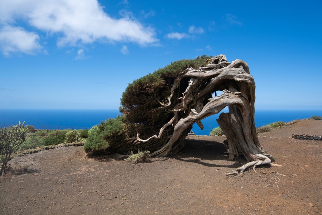 The Phoenicean juniper (Juniperus phoenicea var. canariensis) is the natural symbol of El Hierro. With a dense crown and evergreen foliage, it can reach up to 8 metres in height. Its wood is very aromatic and resistant, and its reddish fruits ripen slowly. It adapts to extreme conditions: from dunes to volcanic cliffs, withstanding winds and drought.
