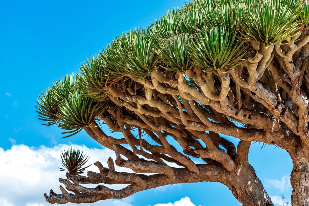 The Canary Islands dragon tree (Dracaena draco) is one of the best-known symbols of the Canary Islands. Its unique silhouette and red sap, called dragon’s blood, make it a legendary tree. It can live for centuries and grow to a great size, such as the 300-year-old dragon tree of Agalán in La Gomera. Impressive specimens can also be found on La Palma and Tenerife.