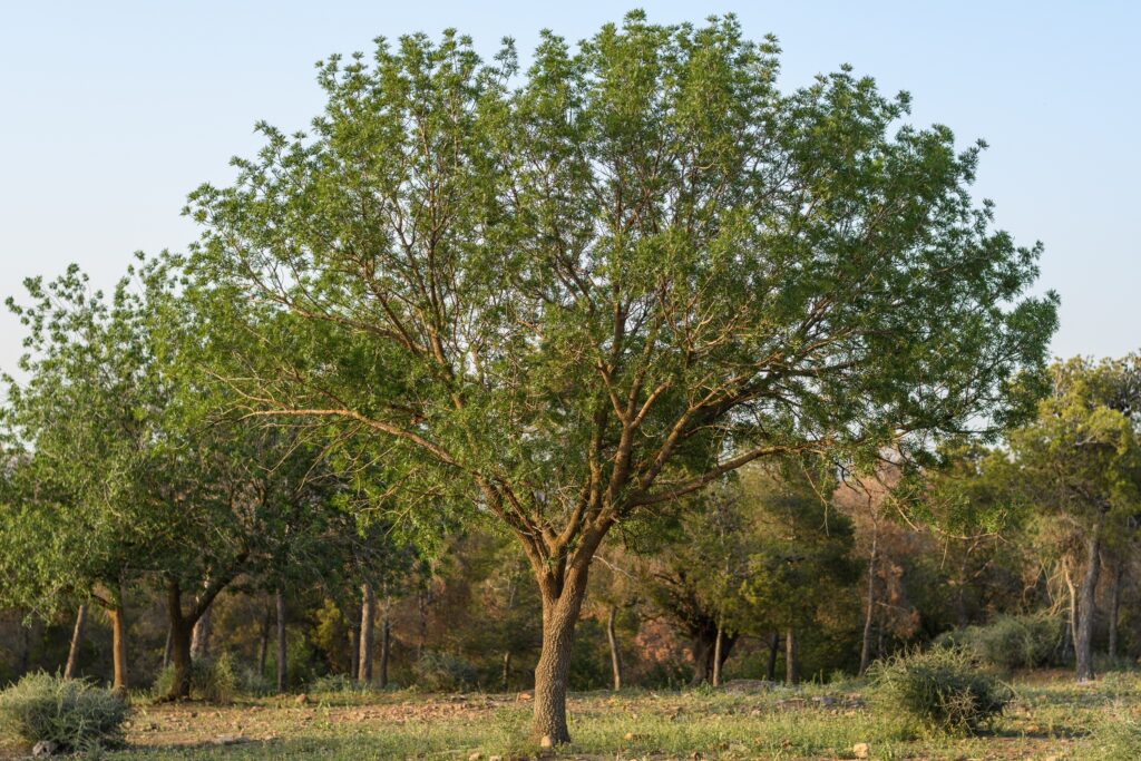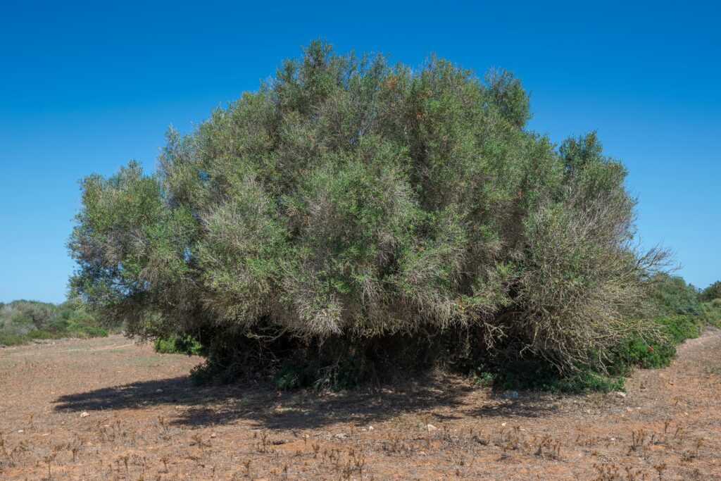 The Atlantic pistachio tree (Pistacia atlantica) is a highly resistant tree that can live for over a thousand years. With a broad crown and ancient appearance, it produces small reddish fruits that turn bluish when ripe. In addition to its beauty, it strengthens the soil against erosion and has been used to obtain aromatic resins and small pistachios.