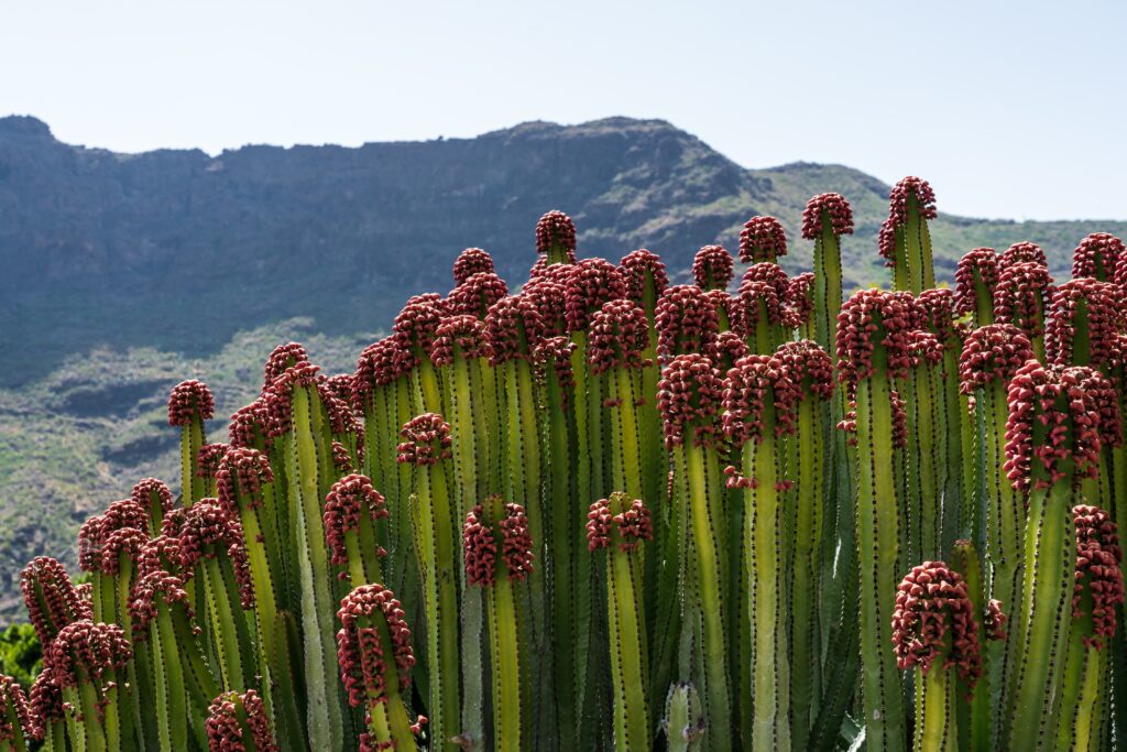 The Canary spurge (Euphorbia canariensis) is a natural symbol of Gran Canaria. With its tall, square stems covered in thorns, it forms large candelabra-shaped bushes that can reach 4 metres in height. Inside, they create microhabitats that are home to many other species. It is one of the most characteristic plants of the dry Canarian landscape.