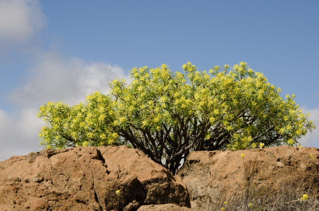 King Juba’s spurge (Euphorbia regis-jubae) is a shrub that can grow up to 2 metres tall and is very common on the eastern islands: Gran Canaria, Lanzarote and Fuerteventura. With its tough green leaves and milky sap, it is perfectly adapted to sunny, dry areas. It is one of the most representative plants of the arid Canarian landscape.